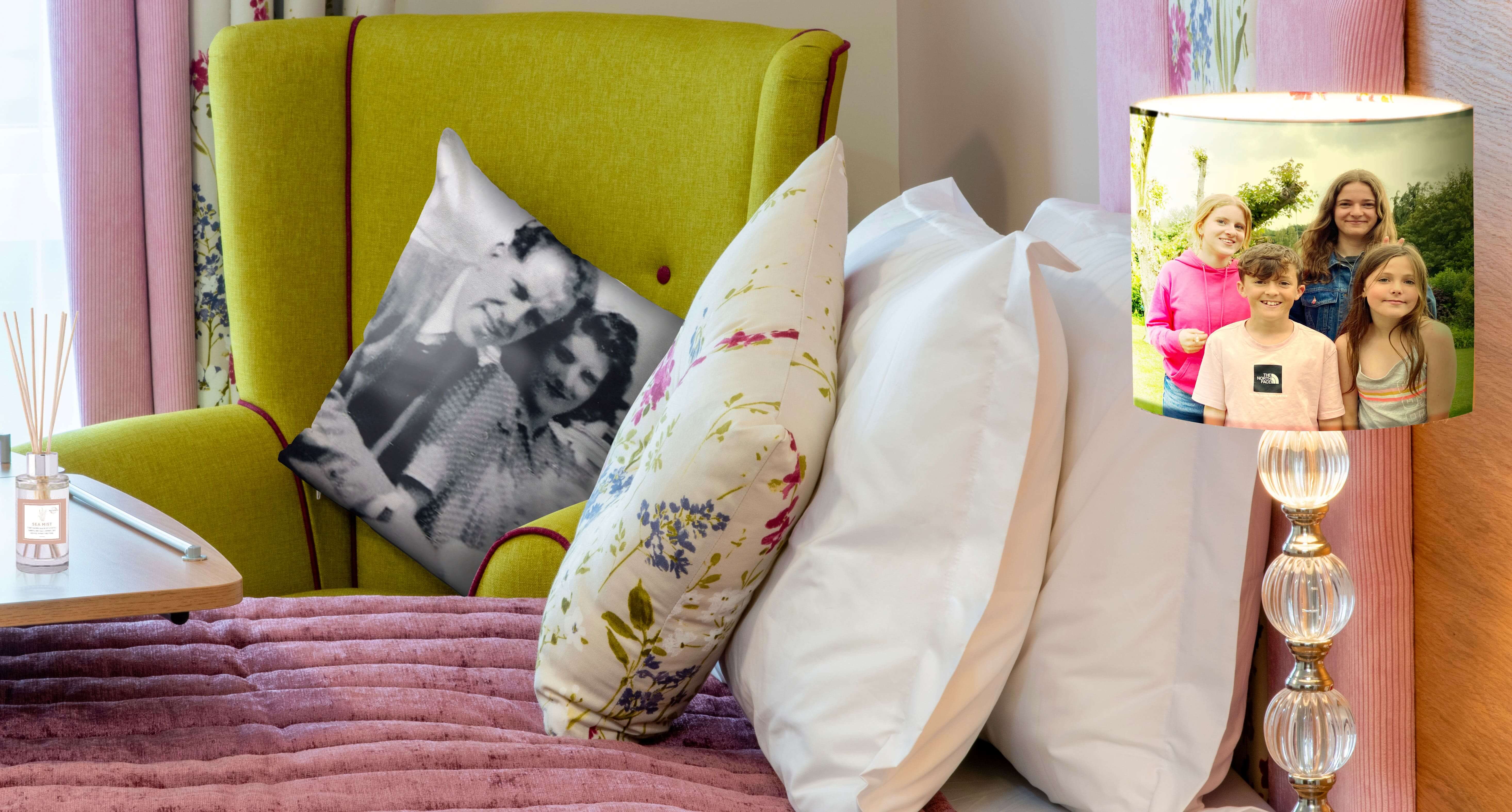 Personalise your care home interior with cherished memories printed onto lamp shades, cushions and chairs transforming personal rooms into sanctuaries of comfort.